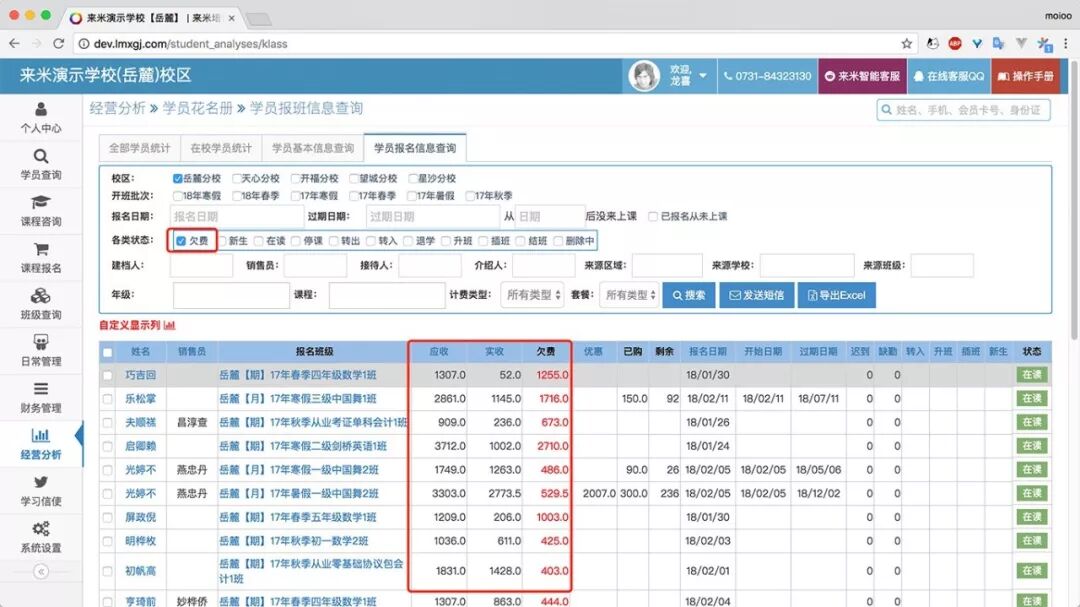 报名名单学费分割成应收、实收、欠费、优惠不同的列,更能一目了然了解学员学费缴纳情况,同时新增快速按欠费状态检索学员列表。「经营分析」-「学员分析」-「学员报名信息查询」