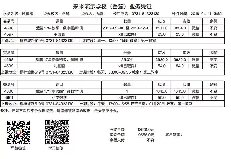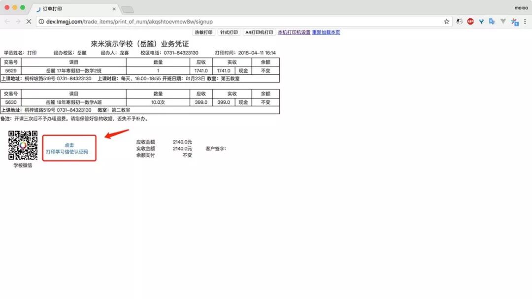 3、打印票据是可以选择是否打印学习信使二维码,在之前如果学生有关注过学习信使就不会再打印,现在关注后可以选择是否打印。