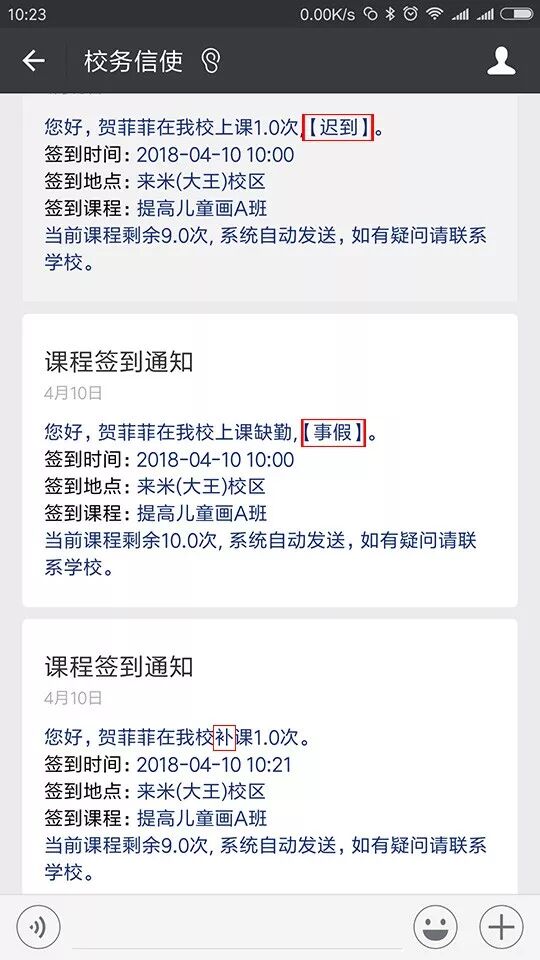 给学员考勤后推送给学生家长的微信通知内容区分是否迟到,缺勤是事假还是病假,是上课还是补课。