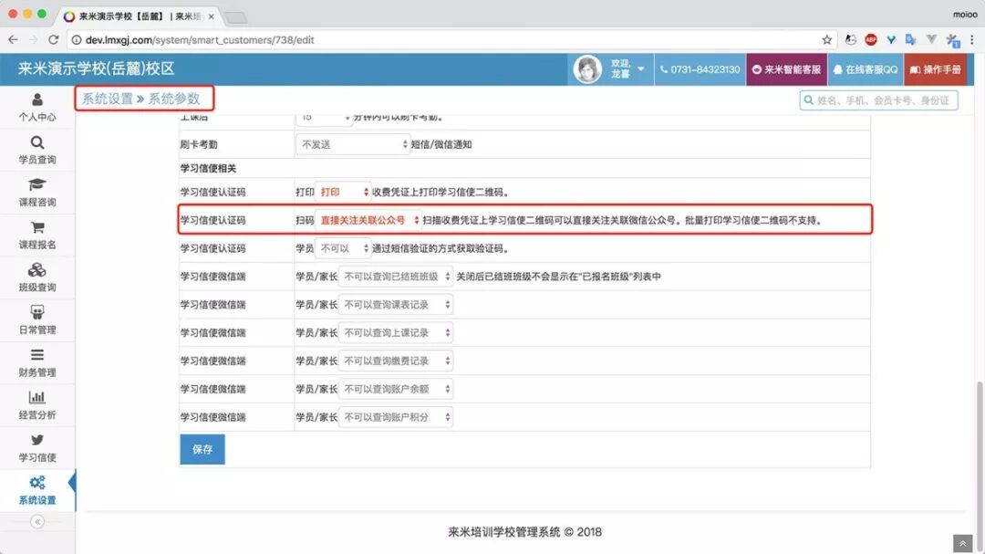 升级后学员家长扫描学校打印的收费凭证上的学习信使二维码可以直接关注微信公众且自动关联学员。相比之前现在直接关注学习信使微信公众号或学校定制公众号,减少各种操作失误导致不能接收微信通知。 默认全部开启该设置,可以在「系统管理」-「参数设置」中关闭。
